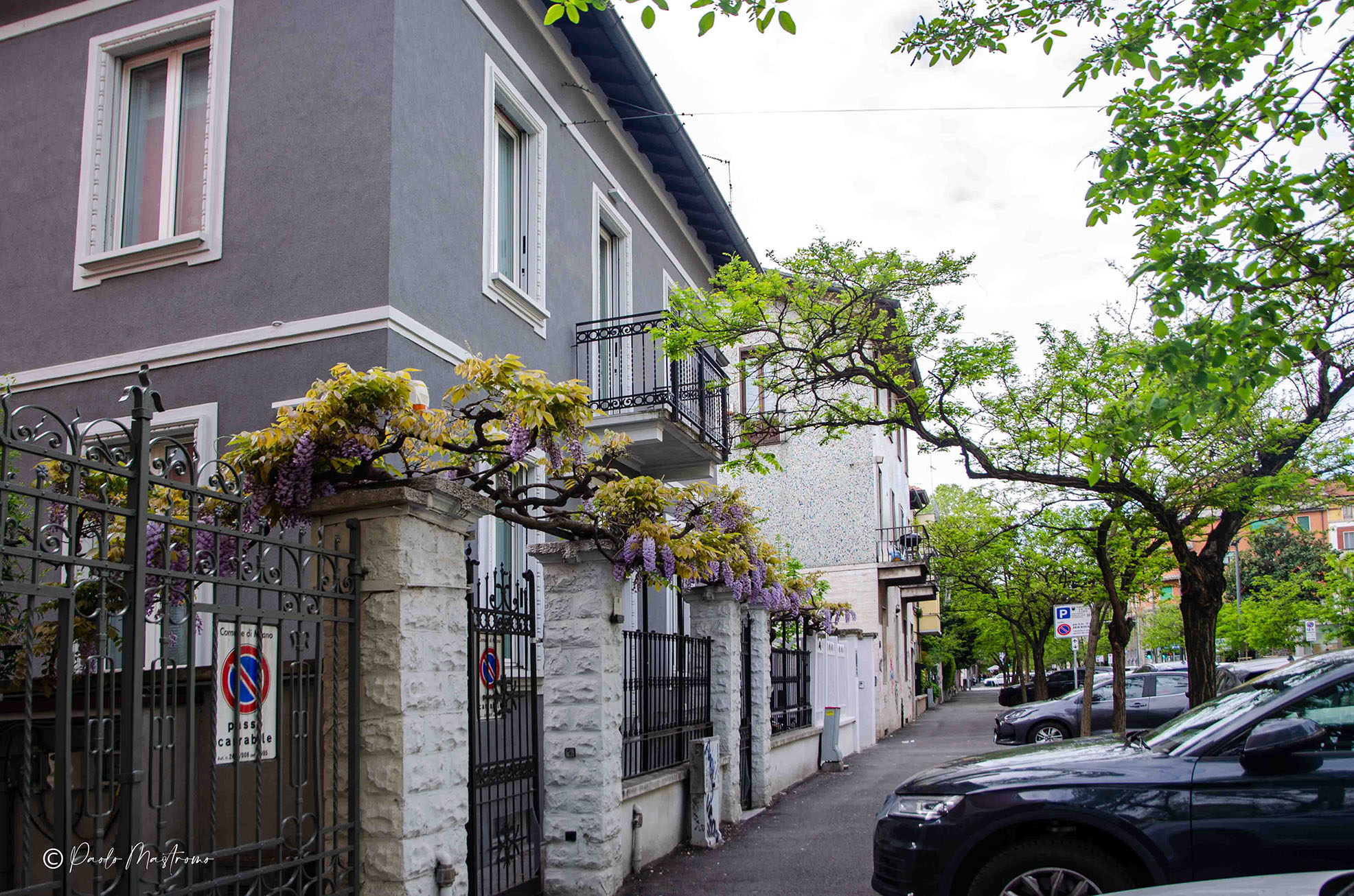 Questo bel colore lilla, che lega straordinariamente con la facciata di questo bell’edificio signorile, ci induce a meditare: sarà stato piantato prima il glicine, in modo da sposarsi con il colore tenue della facciata oppure, al contrario, la facciata sarà stata dipinta, magari dopo una ristrutturazione, in maniera da creare armonia cromatica? Se qualcuno lo sa, lo dica!